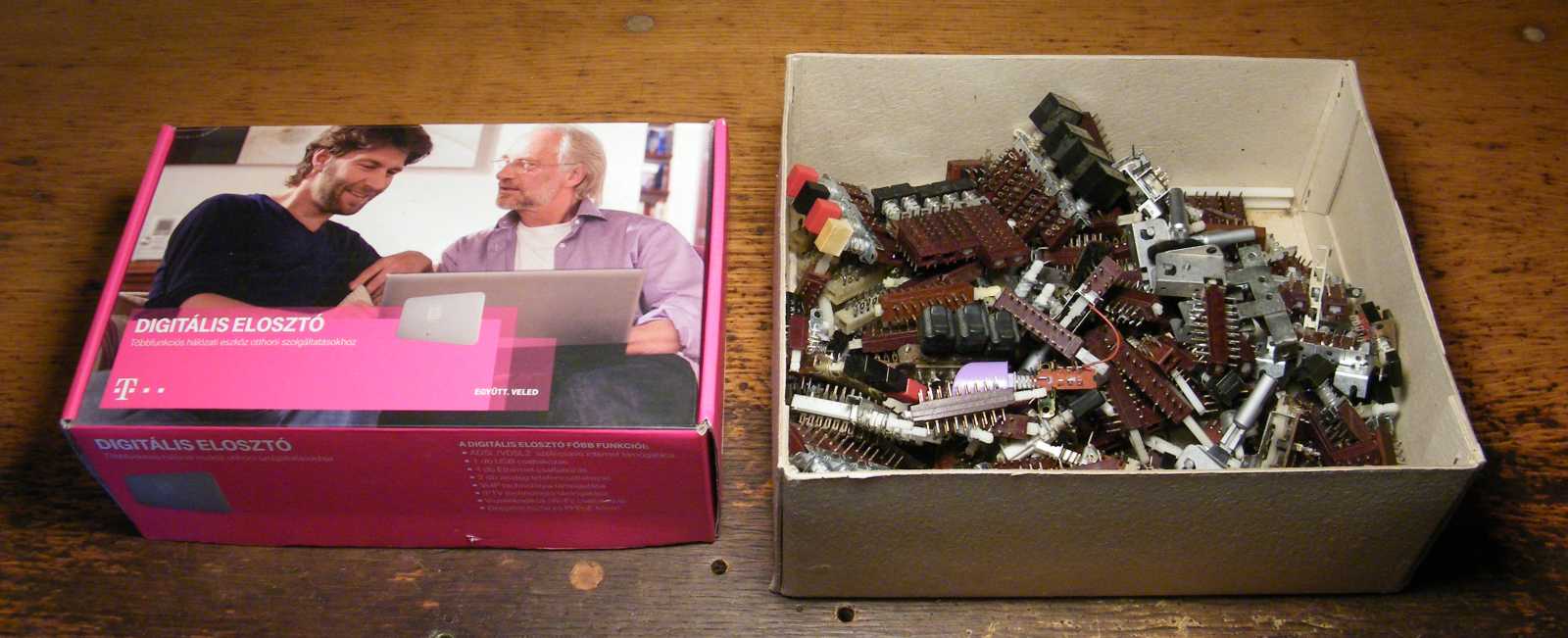 Ehhez képest a kapcsolók az iménti képen látható dobozba nem fértek bele, így kénytelen voltam őket visszaborítani a rózsaszín dobozba, majd ha már egyszer felhoztam őket, menten túrtam is számukra idefent egy még üres dobozt. Mikorra ezzel megvoltam, addigra aznap már annyit mentem, hol a biciklivel, hol meg csak a lábamon a lakásban és a házban, hogy ha aznap nem állt volna belém még ebéd előtt a kajakóma, valósággal tombolt volna bennem a szétszedési vágy! |