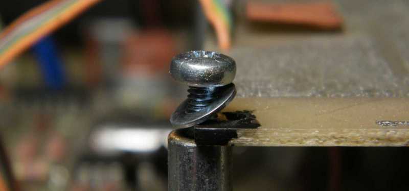 Az előbb még ebből a pontból kiálló, konkrétan a menetbe épp csak egy kicsit belekapó csavarban talán nem is az volt a fura, hogy ki lett tekerve, hiszen erre szükség volt a kijelző panelja alatt található osztóhoz történő hozzáféréshez (no nem nekem, hanem még az előző mesternek), hanem az, hogy a lyuk mélyén nem annyira menet van, mint inkább egyszerűen csak rozsda. Mivel a műszerben sehol sincs nyoma víznek, ez valószínűleg egy már eleve rozsdásan beépített alkatrész volt. Ami mindezeken felül is fura, hogy mégis hogyan lehetett az eredeti csavar betekerve, és még fekete festékpöttyel rögzítve is, ha nincs is a lyukban menet? |
