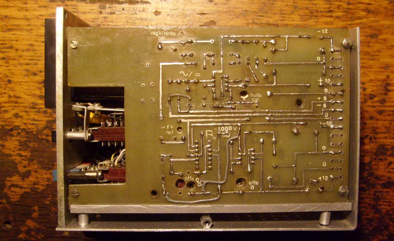 Íme a műszer hátulnézetből. Igencsak érdekes a hálózati csatlakozás megoldása. Kilóg a két tüske a készülék hátuljából, amire rá kell dugni a borotvazsinórt. Ennek legvalószínűbb oka, hogy nem lehetett borotvazsinórhoz való aljzatot kapni. Aztán elgondolkodtató még az is, hogy miért a készülék hátulján van a hálózati kapcsoló. Persze értem. Szinte hallom amint mondod: Géza! Kritizáld a saját konstrukciódat! |