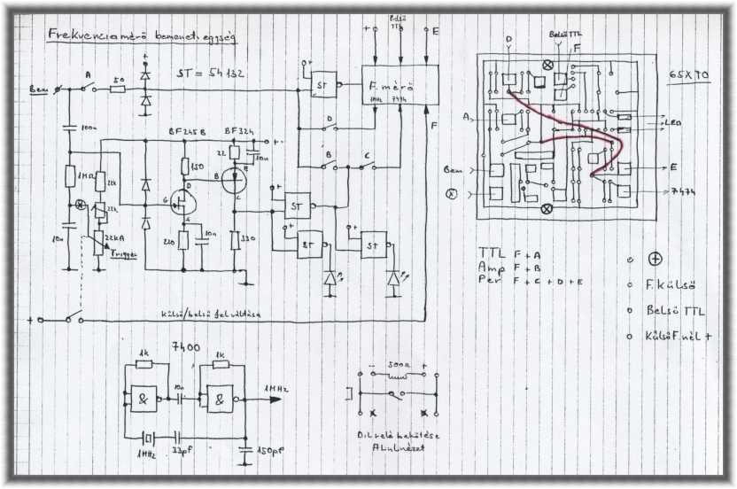 Mivel a frekvenciamérőt nem én építettem, hanem úgy vettem készen, ezért ezek a rajzocskák szerintem a panelen található áramkörök visszarajzolásai. Kicsit módosítottam az eredeti áramkörön. Szerintem gyorsabb kvarcot kapott az órába való helyett, valamint beledrótoztam a periódusidő mérési lehetőséget is. |