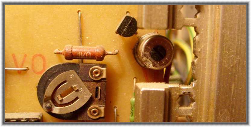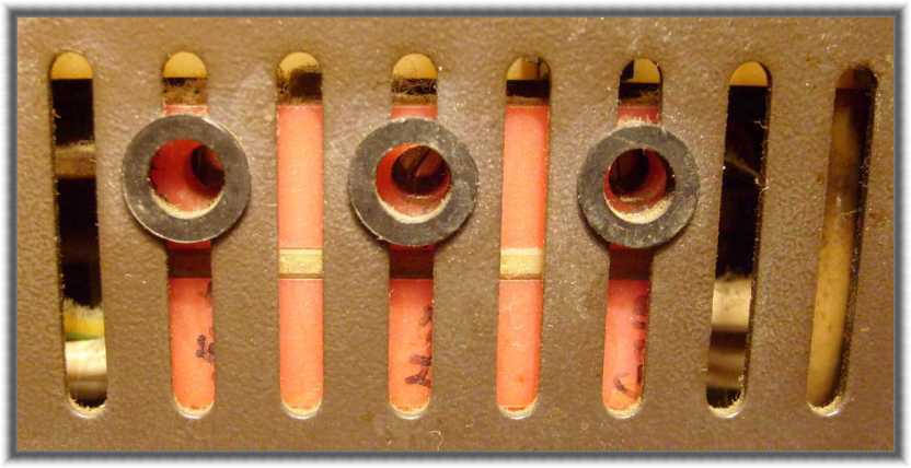 Ez az a három potméter amivel hozzá lehet tekerni a műszert a szkópunkhoz. A megvezető karikák megvezetés céljából vannak, mint ahogy belül a piros hasábok is. Ha nem így volna, akkor kalimpálnánk a csavarhúzóval az alkatrészek között. |