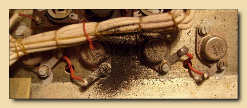 Ezt a részletet nem értettem tisztán, merthogy nincs itt semmi olyasmi, ami pont ide koszolna. Persze ott van a végtranzisztorok felett a bal oldali tüske, de az miért éppen ide hányná le magáról a gumiperemet? Ha szóródna róla a gumi, akkor az mindenfelé szétszórva lenne, nem csak ezen az egyetlen helyen. |