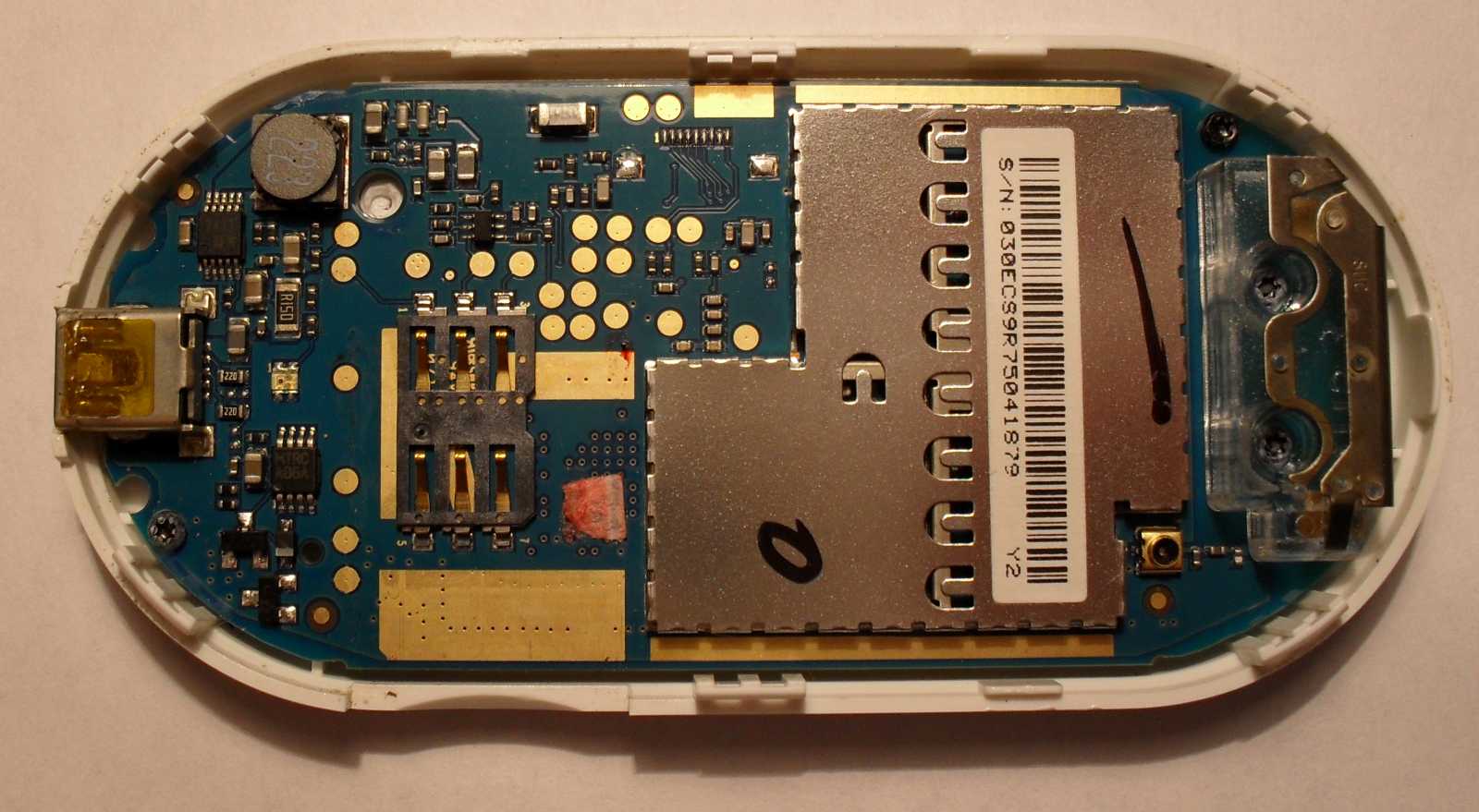 Uncsi trendi vacak, sehol semmi érdekes. Bal szélen USB csatlakozó aljzat, jobb szélen a plexi fém kombináció pedig az antenna. A bádoglemez árnyékolás alatt van a tulajdonképpeni mobiltelefon. Az aranyszínű pettyek érintkezők, ezeken keresztül lehet mondjuk tesztelni, vagy még gyárilag felprogramozni a modemet. |