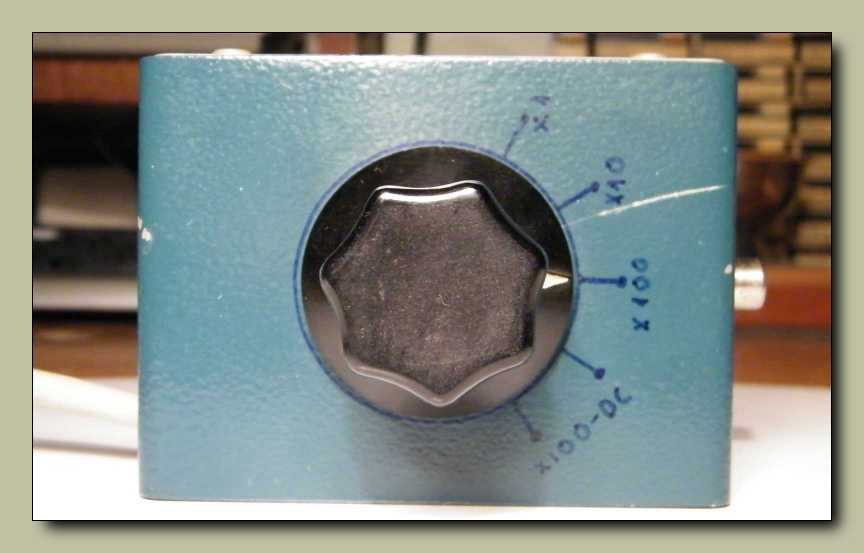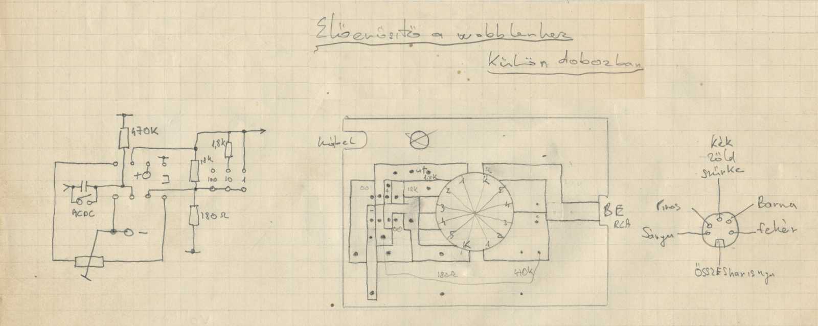 Vagy a woblerszkóp bemenetébe dugom a mérőszondát, vagy az előerősítő irányából érkező tuchelt dugom a műszerbe, a szondát pedig a most bemutatott előerősítőbe. Egyrészt válthatok érzékenységet a wobleren, másrészt az előerősítő dobozán is a nagy fekete kapcsológombbal. Ez utóbbi persze kényelmesebb, mert míg az előerősítő gombja valahol kézközelben az asztalon van az éppen mért valami mellett, addig maga a műszer fent a polcon. |