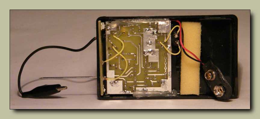 No de nézzük már végre ezt a dobozt. Ezzel a teszterrel valószínűleg beszerelt állapotban is vizsgálhatók az elkók. A krokodilcsipesszel odacsatlakozunk valahova, a tűvel meg rábökünk a panelra. |
