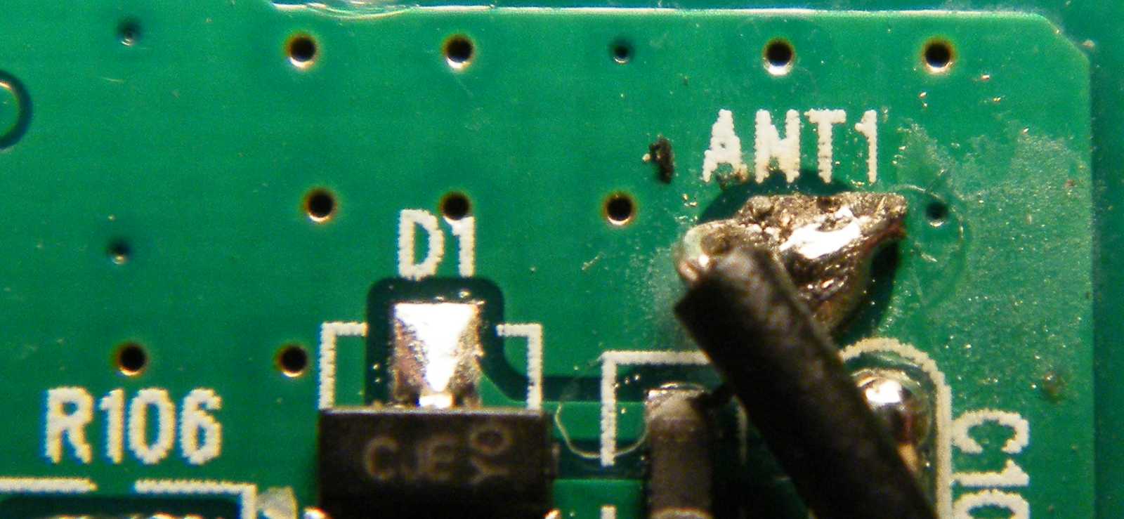 Ez itt az előbb látott forrpont másik oldala, amiről szintén le kellett kapnom (mármint kényszeresen) egy túlméretes óngombócot. Ettől függetlenül, az antenna csatlakozási pontján test mérhető, ami - a szokásos föld felé mutató tekercs okán - valószínűleg nem jelent problémát. |