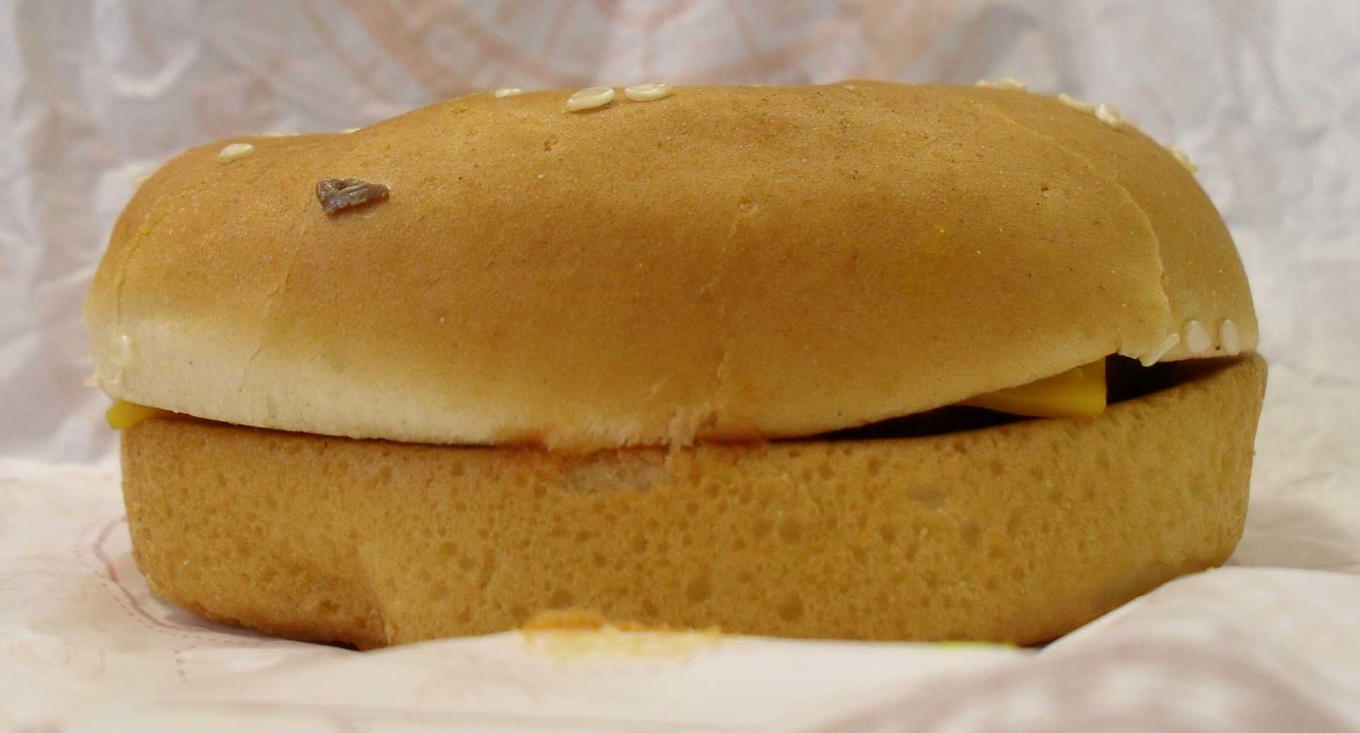Őőő... Izé... Itt kérem valami tévedés van! Lehet, hogy nem tetszett a pofám a kiscsajnak, mire fel egy üres zsemlyét kaptam? De nem szabad ilyet feltételezni... Ez igenis egy sajtburger, csak jóval nagyobb a zsömlye, ami eltakarja a tartalmat. Vagyis én vagyok a hülye, mert egyszerűen csak rossz szögből vakuzom a burgert. |