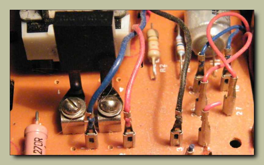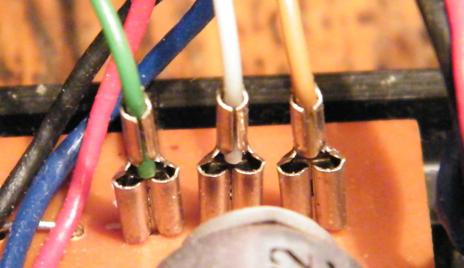 Soha, ismétlem soha egyetlen kollégámnál sem láttam olyan fogót, amivel egy ilyen sarut szakszerűen rá lehetett volna nyomni a vezeték végére! Mint az a fotó mértani közepén látható, kínunkban igen érdekes módon kerültük meg a problémát. A megblankolt drótvéget odafogattuk az eredeti zsinórról levágott saruval. Á nem, ez kicsit sem volt kontakthibás... |