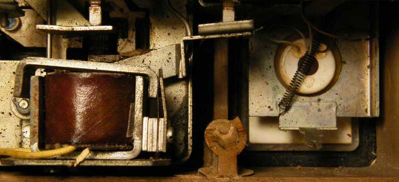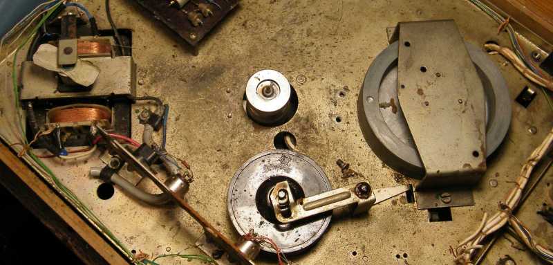 Jobbra a hálózati kapcsolót (lásd balra fent) és a sebességváltót is működtető kapcsoló tengelye látszik. Az viszont erről az oldalról nézve sem látszik, hogy a szíjat átdobó mechanizmussal vajon mi kötötte össze. |