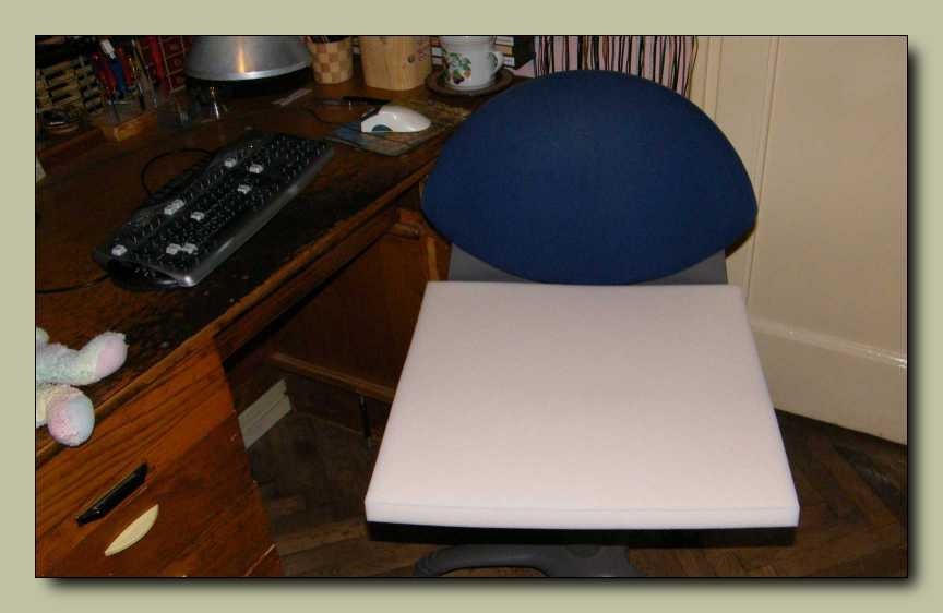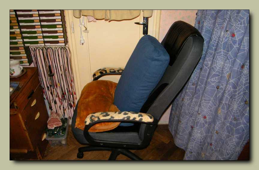 Kicsivel később ezzel a párnával próbálkoztam. Ez így már majdnem jó, csak így ugye nem marad támla ami a hátamat megtámassza. Nincs mese! Illetve van, méghozzá szokatlanul hosszú. Holnap veszek a boltban szivacsot. |