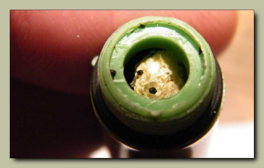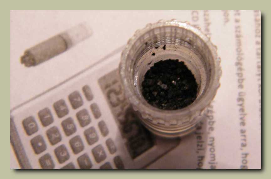 Innen nézve, az átlátszó kupakban némi szénpor látható.