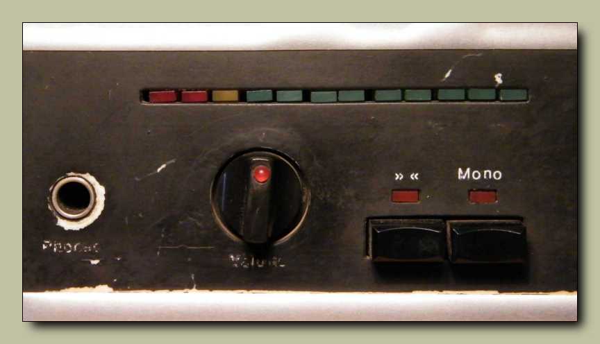 A doboz széléről (ahol a fényes csík van) le lett koptatva a festék. Hogy ez hogyan történt, azt még csak elképzelni sem tudom! Ugyanis az van, hogy a fényes csík úgy kb. fél milliméter vastagságú alumínium hatású tapéta. Rá van ragasztva az előlap szélére. Ha csak le nem tépte onnan valaki, akkor nem lehet mellőle (mert mélyedésben van) lekoptatni a fényezést. Hogy a gombok éléről lekopott a festés, az még csak hagyján. Ez egyszerű használati nyom. No de mi történt a bal oldali gombbal? Hogyan lehet a látott módon összekarmolni egy süllyesztett gomb szélét? A gombokba épített LED, és persze körben a többi, az nem az én ötletem. Karcsi barátom LED mániás, és még csak nem is kicsit! |