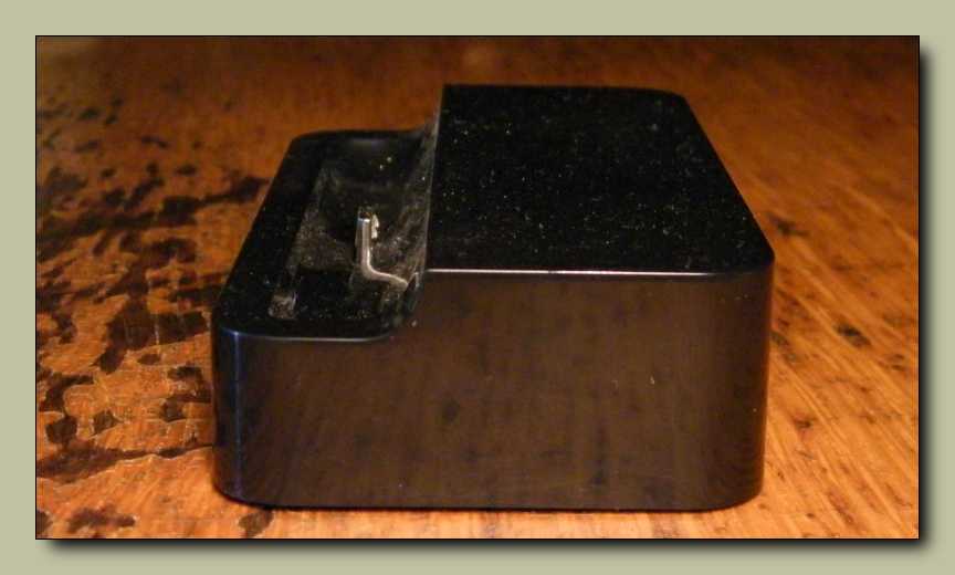 Felül pedig (illetve a mélyedés alján) ez a dugó. Erre a csatlakozóra csusszan rá az okostelefon. Sajnálatos módon, ezen csatlakozón kívül a telefont a helyén nem is tartja más. |