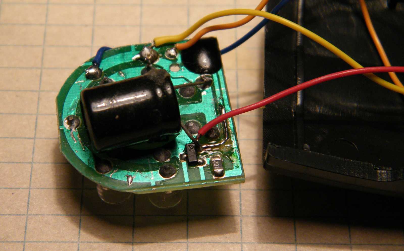 Ha nem is volt egyszerű, de azért csak sikerült beleapplikálni egy 200 mikrós kondért, ami azért kell ide, hogy mikor épp nem jön áram az elemek felől, olyankor az apró áramszüneteket (kontakthiba) áthidalja. Onnan vagyok ilyen okos, hogy a saját lámpámat már jól kitapasztaltam. |