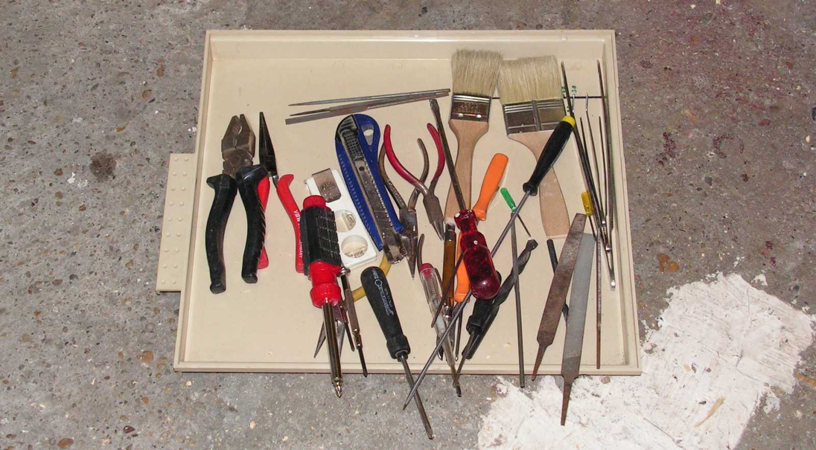 Most épp azt játszom, hogy amelyik szerszámnak már megvan a deszkában a helye (már úgy értem, hogy már ki van fúrva), azt átteszem a betonról a tálcába. Mit ne mondjak, még magamat is sikerült meglepnem a haladási sebességemmel! Ez persze a puszta képekből nem látszik, de csak úgy dőlt a forgács! |