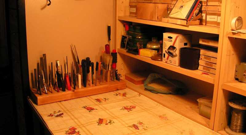 Ez itt az asztal bal oldali sarka. Ezt a szörnyű titkot csak azért árultam el, mert ebből a képből már-már képtelenség kitalálni. Mint azt épp az előbb említettem volt, szerszámok hevernek rajta mindenfelé, ami engem szerfelett idegesít. Persze nem az bennük a bosszantó, hogy vannak, valamint az asztalon (bár mondjuk egy kicsit azért az is), hanem az, hogy mikor keresek valamit, akkor vagy nem találom, vagy igen, csak mondjuk nem elsőre. Hogy amit keresek, az nem elsőre lesz meg, az egyértelműen azért van, mert ezen az asztalon még semminek sincs kialakult helye. Na éppen ezért vagyok most itt, hogy végre változtassak ezen a szörnyű helyzeten. |
